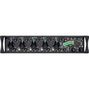 Le côté gauche de l'unité présente trois connecteurs d'entrée XLR symétriques actifs, l'entrée pouvant également être utilisée pour les signaux d'entrée AES3 ou AES42, quatre entrées micro/ligne TA3 symétriques actives, une prise casque jack TRS 3,5 mm asymétrique, un retour Com sur TA3 et une connexion TA5 pour casque/micro/Slate externe.