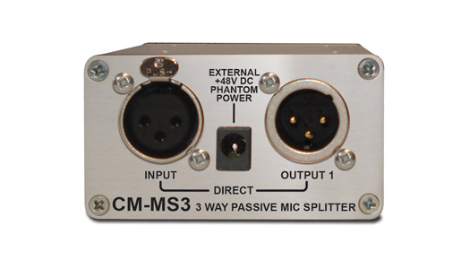 Comme les CM-AESB3 et CM-AESX3, le CM-MS3 est un splitter 1:3. Toutefois, il est conçu pour répartir un signal microphone sur XLR 3pts avec une entrée allant jusqu’à +18dBu et fournir jusqu’à trois sorties sur XLR 3pts. Le transformateur interne permet également l’utilisation de signaux au niveau ligne.