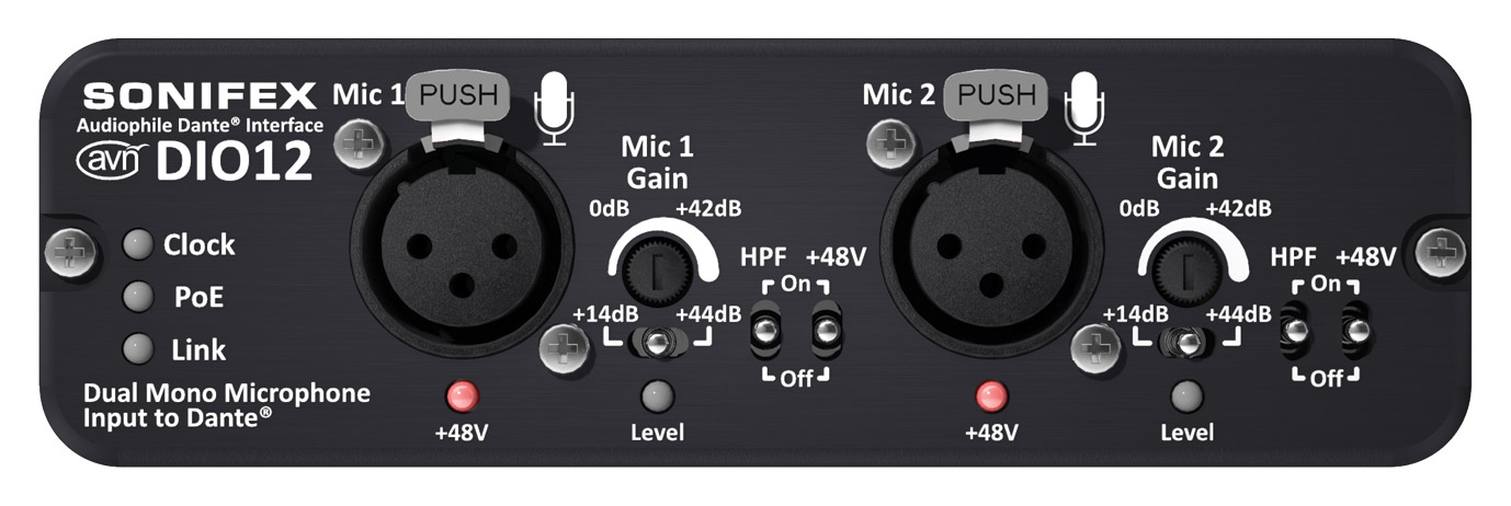DIO12 est une double version d'AVN-DIO09 - incorporant deux entrées micro sur XLR 3 points, et une sortie sur un réseau Dante. Des interrupteurs à bascule permettent à l'utilisateur de régler le gain entre +20dB/+50dB, et un second et un troisième interrupteur à bascule, pour chaque canal, permettent d'activer/désactiver le filtre passe-haut et l'alimentation fantôme +48V respectivement. Une LED s'allume lorsque l'alimentation fantôme est active. Fréquences d'échantillonnage Dante : 44,1 kHz, 48 kHz, 88,2 kHz et 96 kHz, avec codage PCM16/24/32.