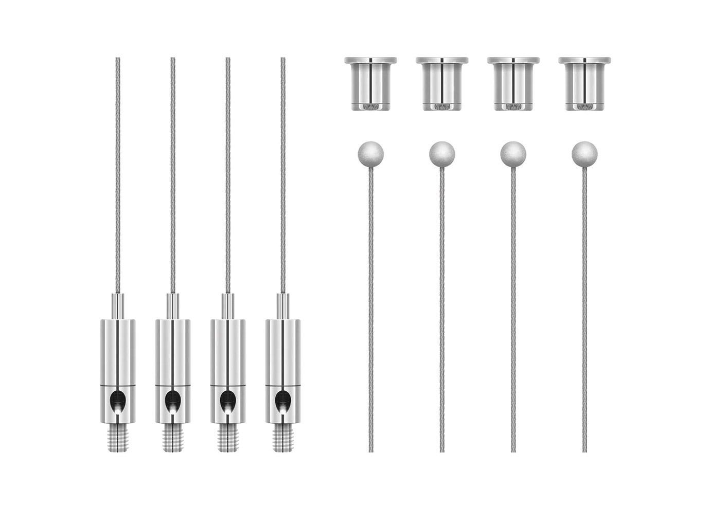 Le kit permet à l'installateur de suspendre le plafond TeamConnect 2 jusqu'à 5 m du plafond. Le kit comprend : 4 fils d'installation au plafond, 4 câbles en acier de 5 m, 4 fils de fixation au plafond.
