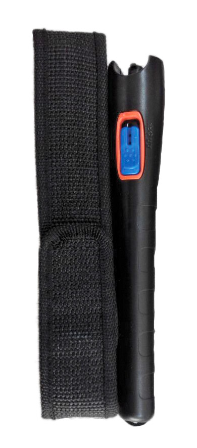 Équipé d'un adaptateur standard de 2,5 mm pour ST, SC, FC et autres connecteurs à virole de 2,5 mm. Fourni avec une housse de transport souple. La lumière a deux modes, continu et flash et est pilotée par un interrupteur d'alimentation encastré en dessous, pour éviter l'allumage accidentel lors du rangement dans sa housse. Nécessite une pile AAA (non fournie).