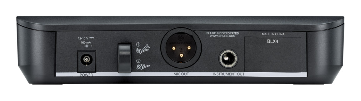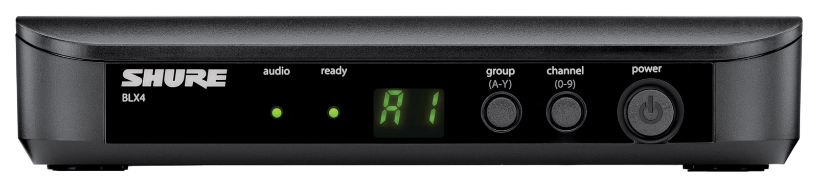 Le récepteur sans fil Shure BLX4 est logé dans un boîtier en ABS moulé et a le rapport coût-efficacité le plus avantageux, tout en offrant les mêmes fonctionnalités de balayages de canaux et de groupes avec antenne interne pour un transport plus facile. L'avant présente le mouton marche/arrêt, les touches de balayage de canaux et de groupes ainsi qu'un affichage LED à deux chiffres affichant le canal choisi. Une LED s'allume en vert lorsque l'émetteur est relié à la fréquence d'un émetteur et peut être utilisé. Une deuxième LED bicolore s'allume en vert indiquant que le niveau audio est normal et en rouge indiquant la crête ou la surcharge. L'arrière dispose de l'entrée secteur CC 12-15V, 160mA, trois sorties XLR symétriques et une sortie jack 6,35mm de niveau ligne.