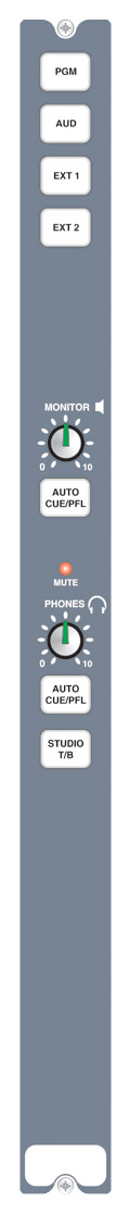 Pour le monitoring de diverses sources sur les enceintes de la régie et le casque (de l'animateur). Les enceintes doivent être attaquées par un amplificateur de puissance convenable connecté à la sortie de monitoring du canal. Une commande de façade fait varier le niveau d'écoute. Un casque peut être directement branché au connecteur casque du canal sur le panneau avant ou arrière via la commande de niveau. Un groupe de commutateurs quatre voies à verrouillage électronique sélectionne la source envoyée aux enceintes et au casque entre les deux entrées externes, la sortie PGM ou la sortie AUD. Les boutons "Auto PFL" adjacents à chaque commande de niveau permettent le monitoring de PFL quand un canal d'entrée a été sélectionné pour CUE/PFL. Des cavaliers internes peuvent être configurés pour que la PFL remplace ou atténue la source sélectionnée. De plus, Split PFL peut être sélectionné pour le casque, ce qui place la source sélectionnée en mono dans une oreille et la PFL en mono dans l'autre. Un réseau d'ordres global peut être établi pour permettre à tous les points de contribution de la régie et du studio de communiquer entre eux via leur microphone et leur casque. Une diode lumineuse Mute s'allume quand un canal de microphone activé en régie a coupé les enceintes.