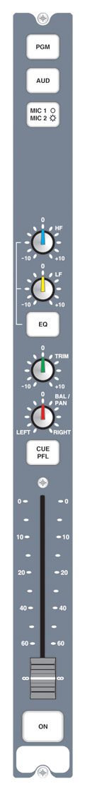 Entrée mono avec bouton sélecteur micro/ligne mono. Si l'entrée micro est employée pour le micro de l'animateur, celui-ci peut devenir le micro d'ordres. La fonction réseau d'ordres sera conservée quand l'entrée du canal sera basculée sur ligne. L'égalisation est montée en standard sur ce canal et s'active par le bouton EQ, donnant 10dB d'atténuation et de gain dans les hautes fréquences (6,5kHz) et les basses fréquences (100Hz). L'entrée micro a un filtre passe-haut sélectionnable par cavalier pour supprimer les intrusions de basses fréquences. Une commande Pan facilite le positionnement stéréo. Un départ/retour d'insert symétrique de niveau ligne est disponible pour l'entrée micro mais est désactivé en mode ligne. Le réglage grossier de gain du canal se fait par presets internes pour micro et ligne; le réglage fin par la commande Trim de façade qui donne un gain de +/-12dB. Le canal a une fonction d'écoute avant fader (CUE/PFL) pouvant être automatiquement désactivée quand le fader est ouvert. Il y a des entrées logiques de télécommande pour couper le micro en cas de bruits et inverser le réseau d'ordres, et des commandes de sortie pour les voyants de signalisation micro et la télécommande ligne de démarrage/arrêt par fader ou bouton ON. (Les sorties de télécommande sur le connecteur sub-D 9 points reçoivent leur signal d'opto-isolateurs NPN). L'entrée micro propose une sortie commutable par cavalier pour faciliter la coupure en régie ou studio et les fonctions de minuterie. De plus, l'entrée ligne peut avoir toutes les fonctions de l'entrée micro quand elle est employée comme entrée micro avec un ampli micro externe.