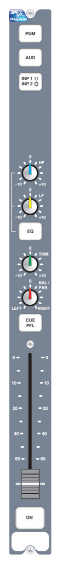 Il y a onze canaux d'entrée pouvant être montés dans n'importe quel emplacement libre en partie basse du châssis de la console. Il est possible d'installer des faders Penny & Gilles de haute gamme pour les entrées et sorties des canaux (disponibles sur commande spéciales). Chaque entrée peut être programmée pour activer/désactiver les fonctions des boutons, si nécessaire, ainsi que d'activer différents modes d'opérations du bouton "fader up/ON".erent modes of operation of fader-up/ON button.