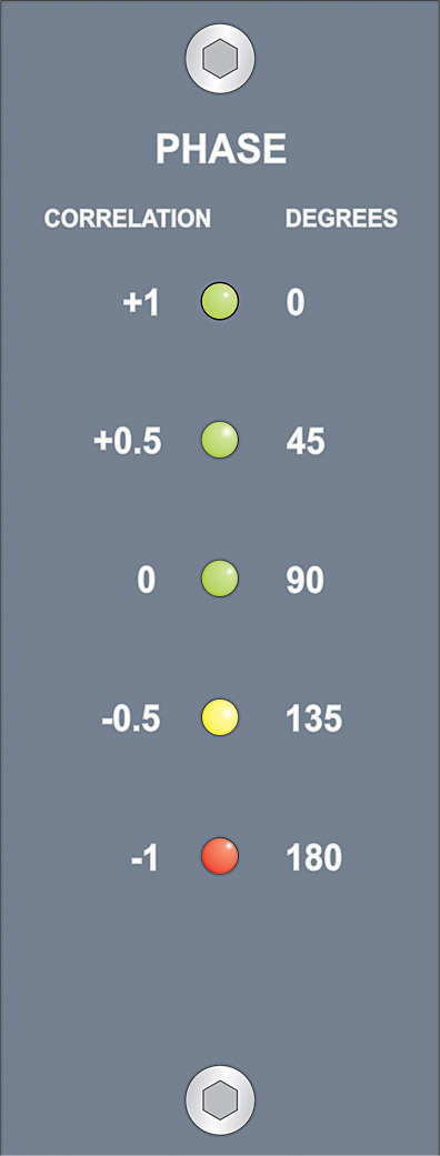 Celui-ci fonctionne sur la source sélectionnée aux mètres connectés. Cinq témoins LED montrent l'angle de phase par pas de 45° de 0° à 180°.