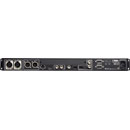 La connectivité prévoit 2x SDI sur connecteurs BNC, 4 paires d'entrées AES sur connecteur HD15, 16x sorties audio analogiques sur 2x connecteurs D-sub à 25 pts, et deux XLR 3 pts symétriques pour la sortie Downmix analogique. Les cages SFP 4x permettent un choix de connecteurs en option et de traitement du signal. Un port USB inclus permet à l'utilisateur d'effectuer des mises à jour logicielles, d'importer/exporter des préréglages et de charger des appareils. La puissance de sortie des enceintes est de 15 watts RMS par côté, 30 watts en crête, avec une sortie acoustique de 104 dB SPL à 2 pieds.