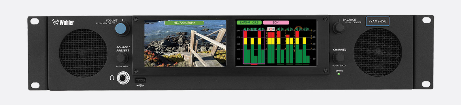 L'iVAM2-2 présente de nombreuses caractéristiques de l'iVAM1-1, mais il est logé dans un rack 2U avec deux écrans tactiles CLD de 4,3 pouces. L'unité est livrée en standard avec des entrées 3G-SDI et analogiques, mais des options pour des signaux supplémentaires sont disponibles, notamment ST-2110, ST-2022, AES3, Dante, Ravenna ou MADI64.