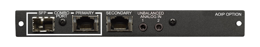 Option de mise à niveau du matériel avec clé logicielle qui permet de surveiller jusqu'à 64 canaux d'entrée Dante. La connexion s'effectue via des ports RJ45 primaires et secondaires, ainsi que des connecteurs TOSlink et SFP. Il comprend une carte AoIP permettant le support primaire et secondaire RJ-45 pour le support hitless/2022-7 (pour les signaux Dante et 2110-30). Une cage Gigabit SFP permettant l'utilisation de SFP multimode et monomode pour les signaux AoIP est également incluse.